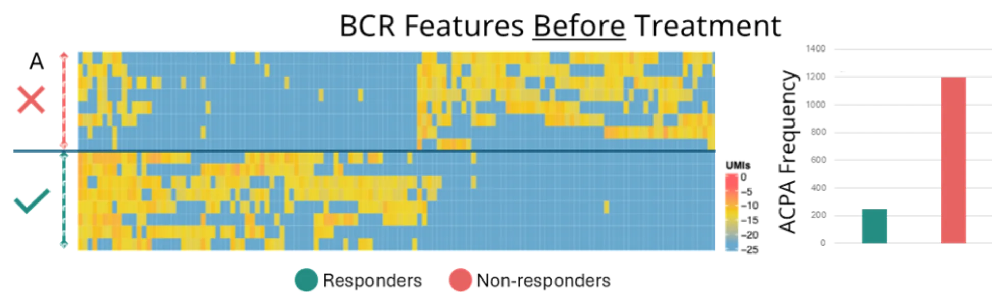 - Using raw TCR cluster frequencies as features enabled the qualitative separation of responders and non-responders.