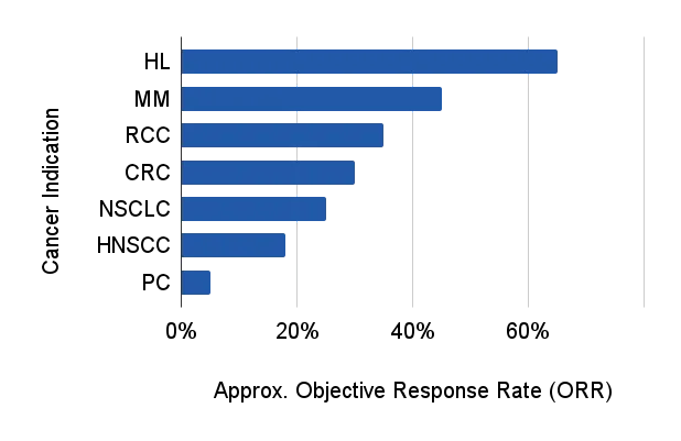 Approximate Objective response rates for cancer immunotherapies by indication (Haslam et al.). HL: Hodgkin’s Lymphoma, MM: Melanoma, RCC: Renal Cell Carcinoma, CRC; Colorectal Cancer, NSCLC: Non-Small Cell Lung Cancer, HNSCC: Head & Neck Squamous Cell Carcinoma, PC: Pancreatic Cancer.