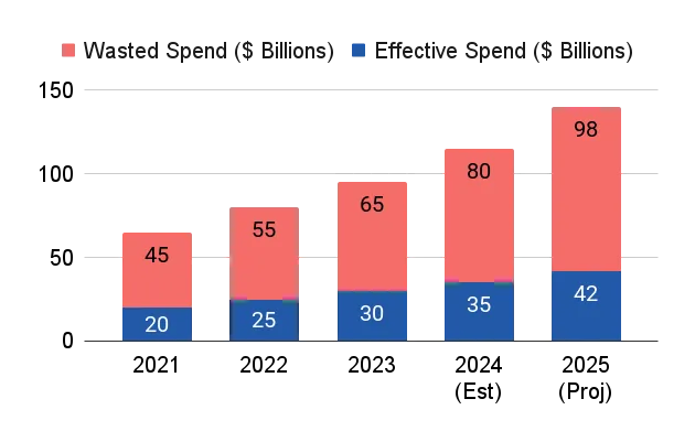 Estimated global spending on immunotherapy drugs, segmented by "Effective Spend" (patients who benefit) versus "Wasted Spend" (patients who do not respond but incur the cost). Source: IQVIA Oncology Trends.
